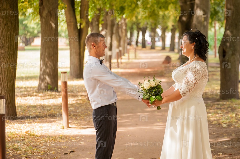 Жених и невеста смотрят друг на друга и нежно ласкают руки