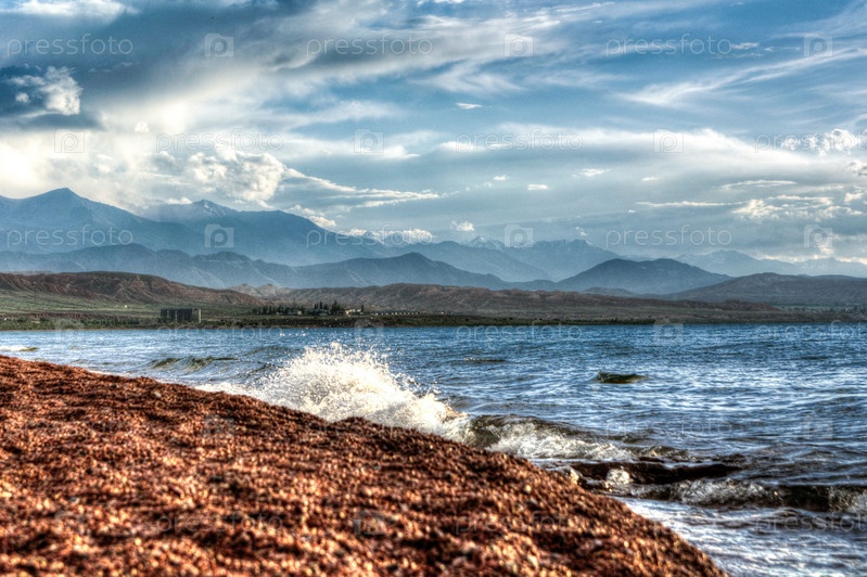 Закат на озере Иссык-Куль, фокус на переднем плане