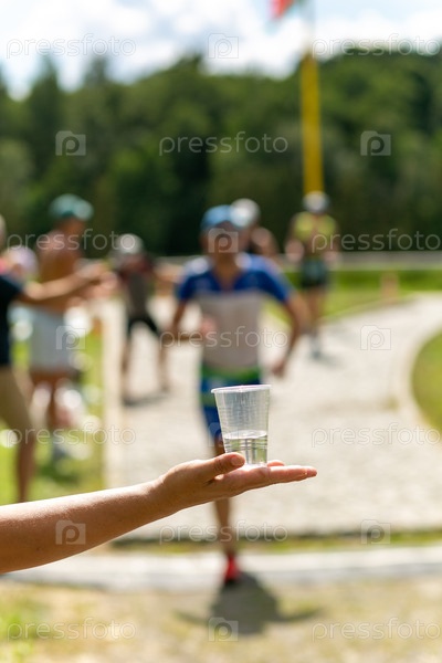 Волонтер в белом платье протягивает пластиковый стаканчик с водой бегуну по триатлону. Изображение передает дух поддержки и общности на спортивном мероприятии, подчеркивая выносливость и командную работу