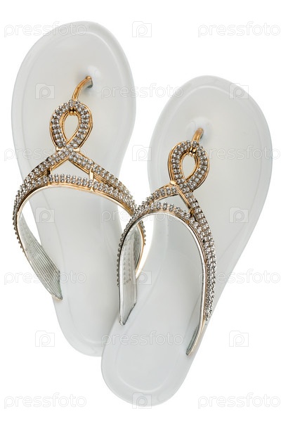 Роскошные, украшенные стразами, белые пляжные шлепанцы, изолированные