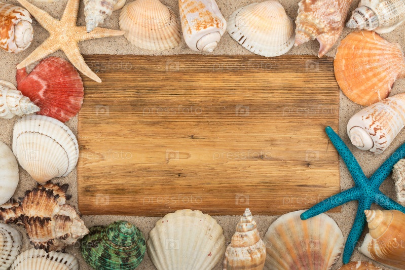 Пустая рама из светлого дерева, ракушек и морских звезд на песке. С пространством для вашего текста