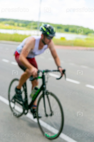 Размытое расфокусированное изображение велосипедиста в спортивной одежде, защитном шлеме и зеркальных очках