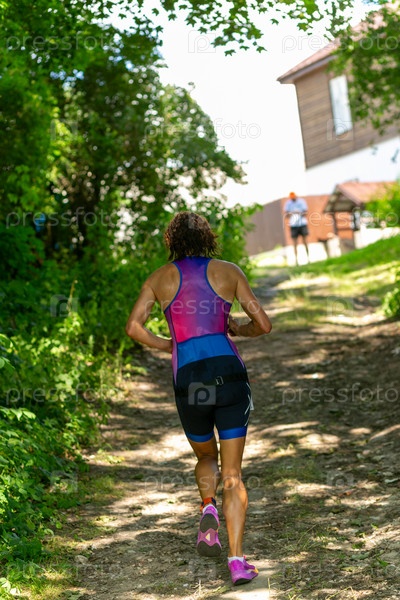 Вид сзади на активную молодую женщину, бегущую во время соревнований по триатлону