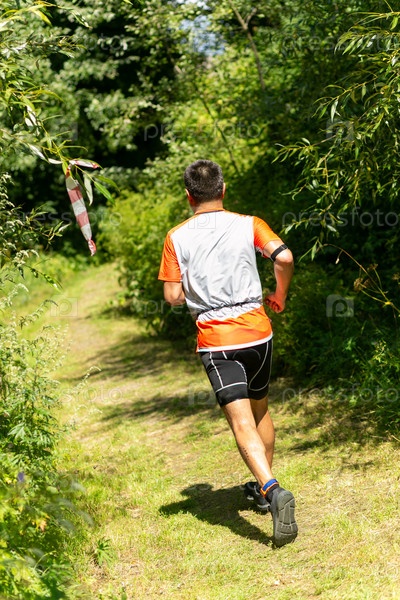 Вид сзади на активного молодого человека, бегущего во время соревнований по триатлону. Участник соревнований по бегу бежит по лесной тропинке