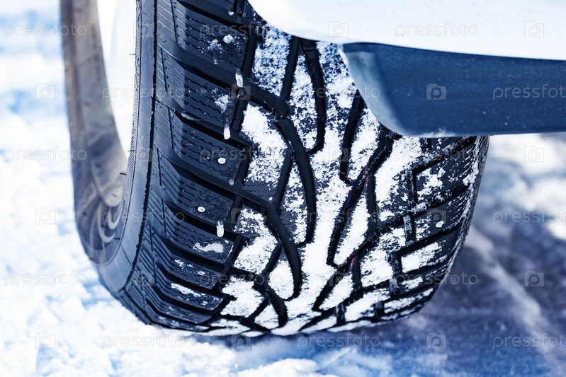 Крупный план автомобильной шипованной шины, покрытой снегом на зимней заснеженной дороге