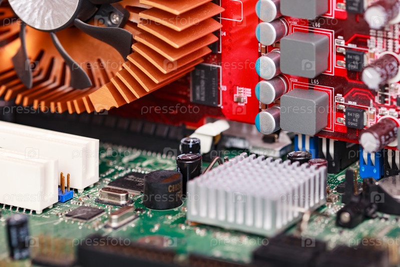Крупный план современной материнской платы и видеокарты