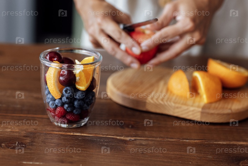 Крупный план стеклянной чаши с фруктами и ягодами и женских рук. Молодая женщина нарезает салат из свежих фруктов