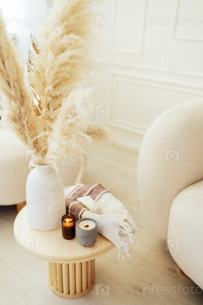 Зажженные ароматические свечи, макетный крем, ваза и плед на круглом журнальном столике. Уютный домашний интерьер в бежевых тонах. Украшения для спа или салона красоты. Копирование пространства