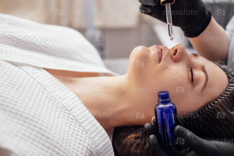Косметолог наносит сыворотку из пипетки в перчатках на лицо клиента в спа-салоне