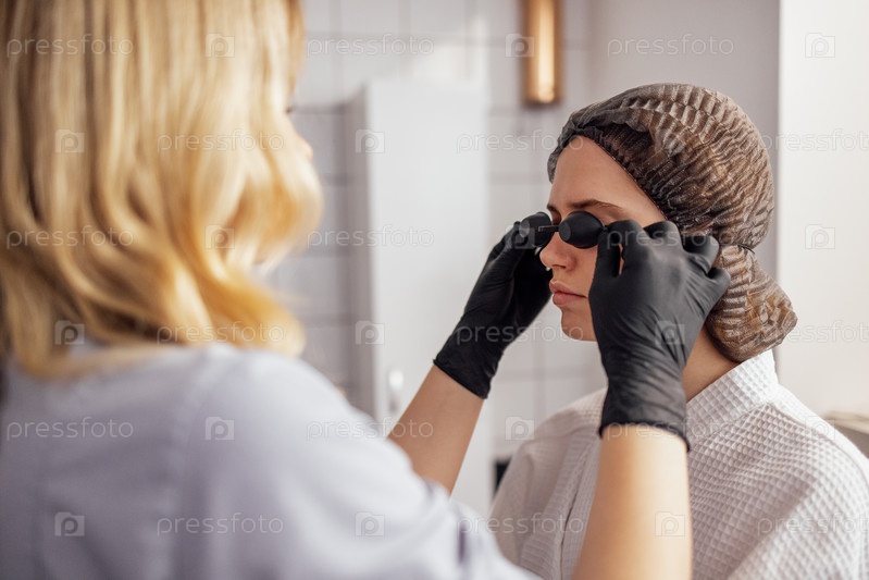 Молодая женщина закрывает глаза специальными очками для депиляции перед процедурой удаления волос
