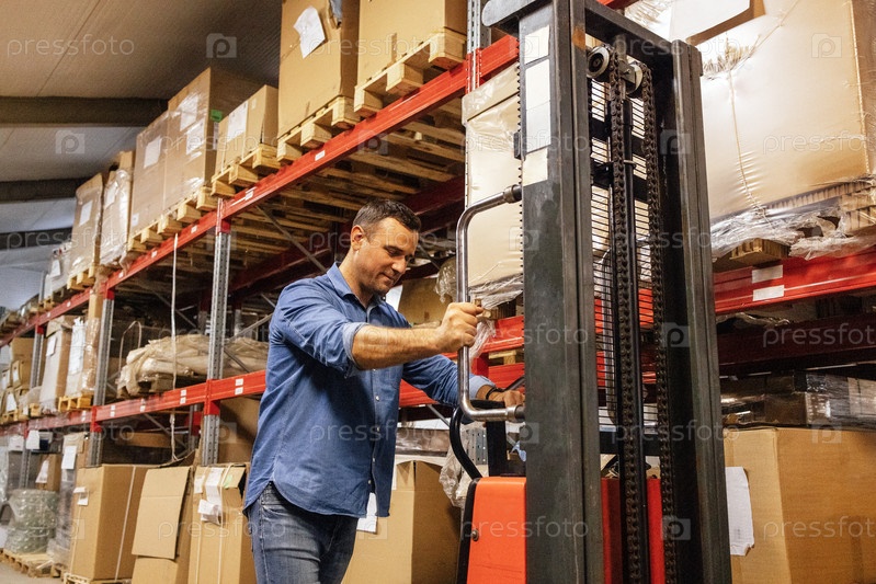 Молодой улыбающийся мужчина на складе с вилочным погрузчиком. Привлекательный работник в повседневной одежде