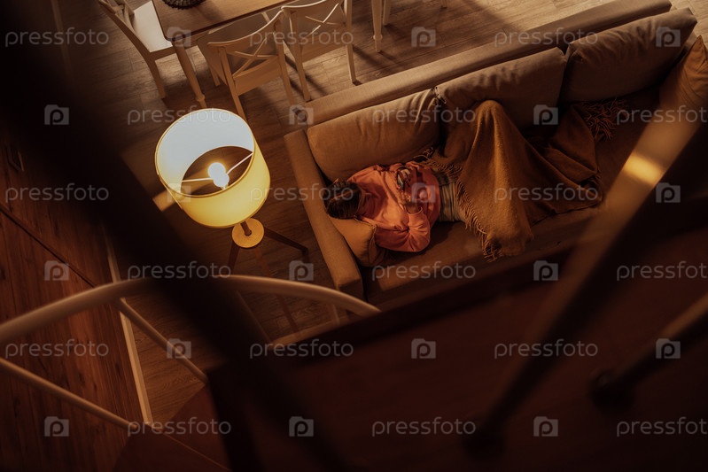 Подросток в повседневной одежде лежит с мобильным телефоном на диване. Милая девушка пользуется телефоном и отдыхает в гостиной. Вид сверху