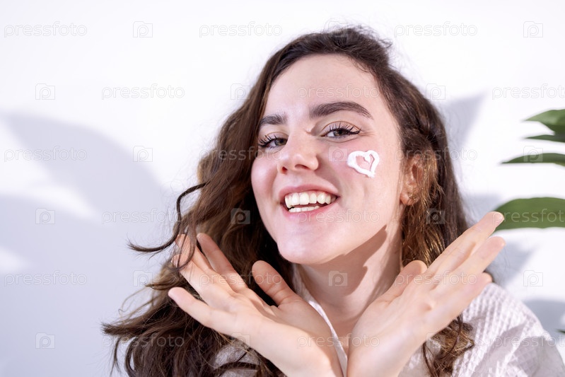Крупный план молодой привлекательной женщины в халате, смеющейся в спа-салоне. На лице улыбающейся рыжеволосой девушки нарисовано кремовое сердечко