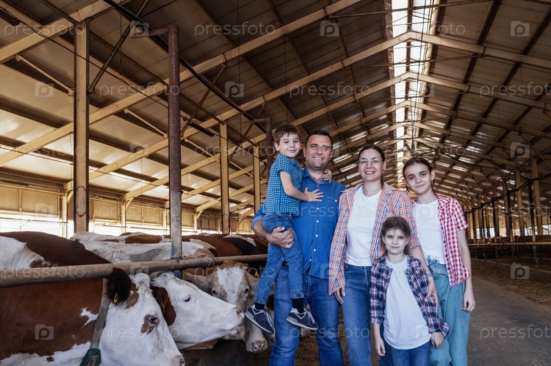Счастливая семья фермеров в коровнике. Молодая семейная пара и их дети заботятся о домашних животных на ферме