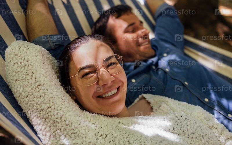 Молодая семейная пара отдыхает на заднем дворе дома. Привлекательные муж и жена лежат в гамаке на улице. Счастливая семья проводит время вместе и наслаждается отдыхом