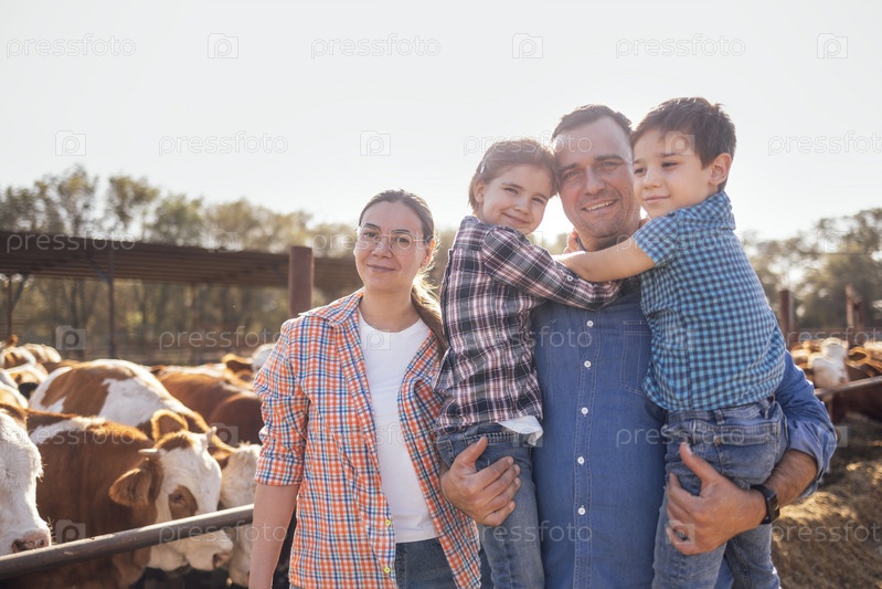Молодая счастливая семья фермеров в коровнике. Улыбающаяся женщина, мужчина и двое детей в повседневной одежде заботятся о домашних животных на ферме