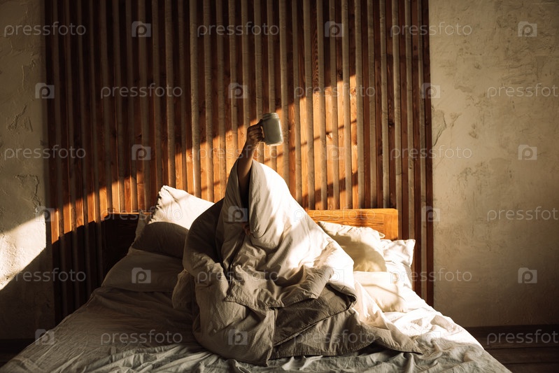 Человек завернут в одеяло и сидит на кровати с чашкой кофе. Мужчина держит чашку чая и поднимает тост. Доброе солнечное утро