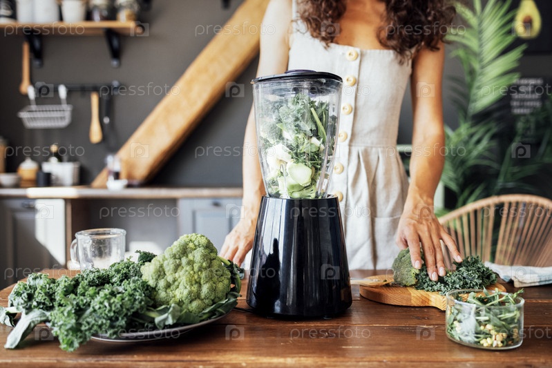 Крупный план блендера с зелеными травами и овощами. Молодая женщина в льняном сарафане готовит на кухне свежий полезный коктейль