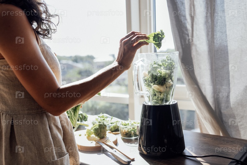 Крупный план блендера с зелеными овощами и травами и женских рук с листом волнистой капусты. Девушка делает витаминный коктейль дома