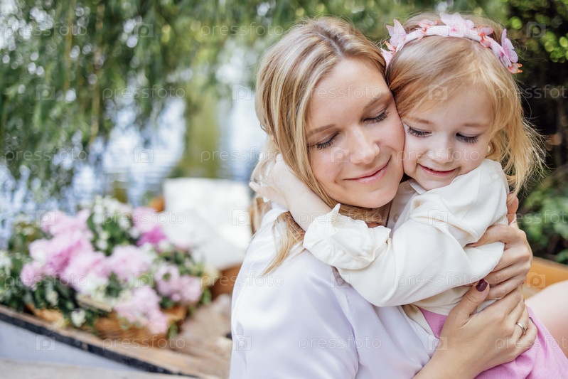 Милая блондинка развлекается со своей очаровательной мамой на свежем воздухе в саду