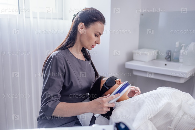 Портрет расслабленной молодой клиентки, получающей УЗИ лица SMAS