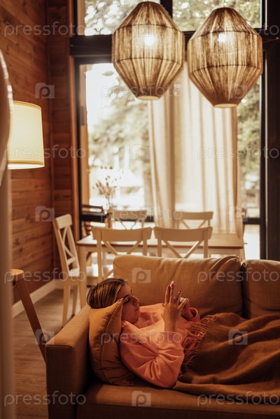 Подросток в повседневной одежде лежит с мобильным телефоном на диване