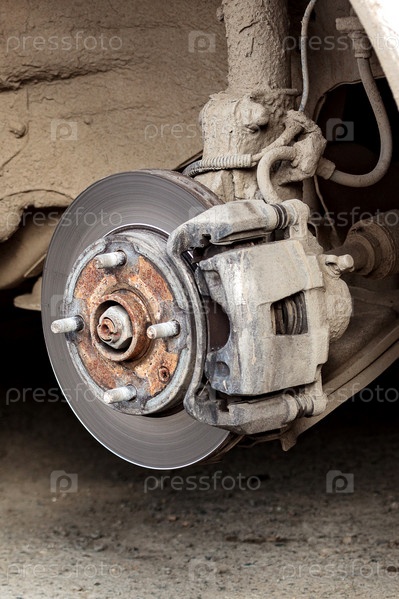 Снимок крупным планом дискового тормоза автомобиля без колеса