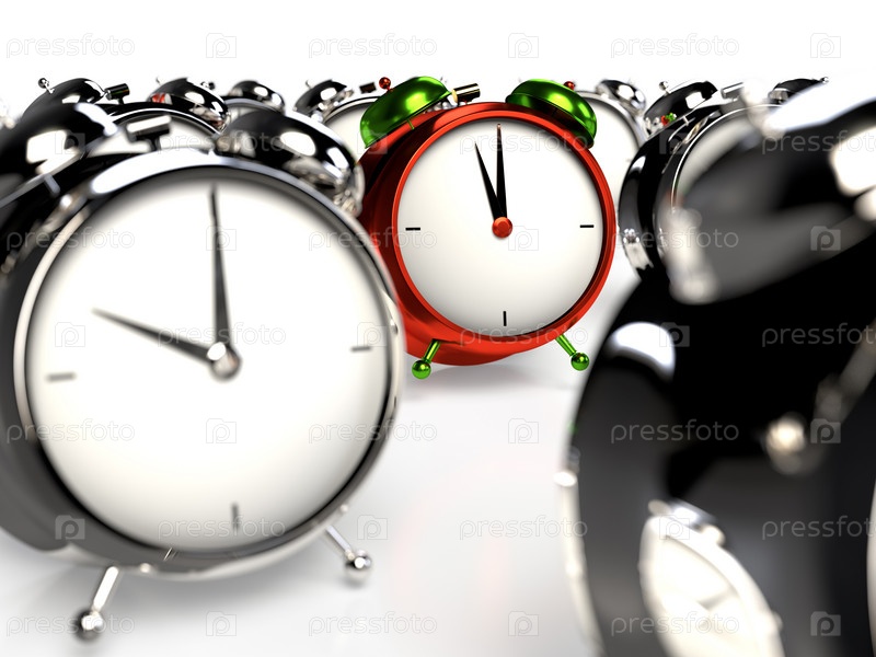 Цветная будильник среди серых будильников. 3D-рендеринг