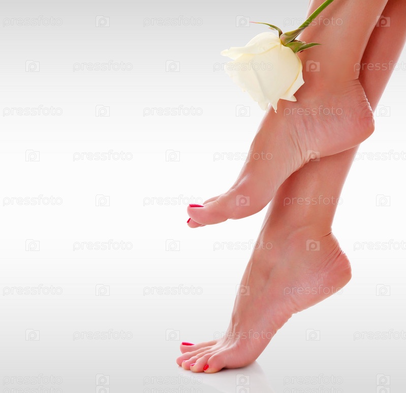 Крупным планом снимок женских ног с цветком белой розы на сером фоне с копировальным пространством
