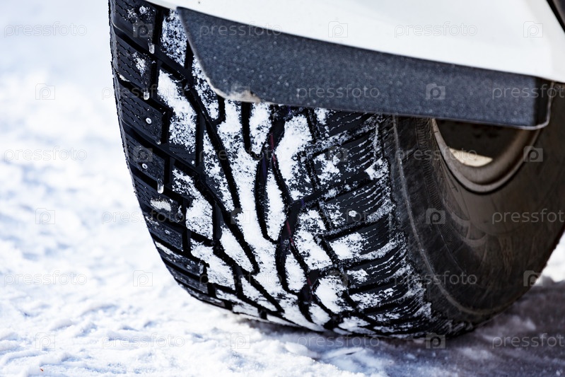 Крупный план автомобильной шипованной шины, покрытой снегом на зимней заснеженной дороге