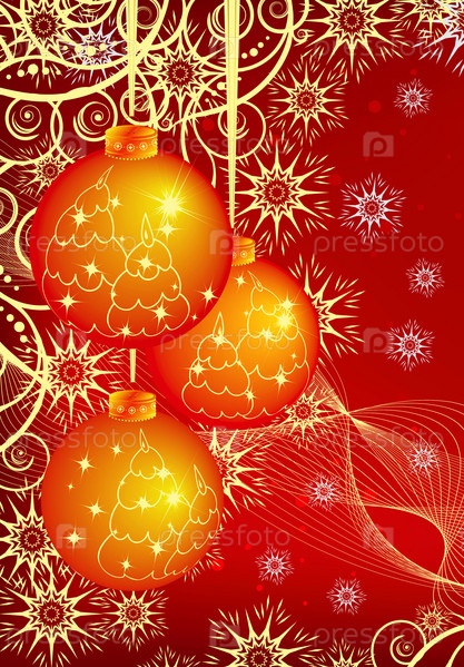 Рождественский фон с тремя светящимися блестящими шарами, новогодними украшениями