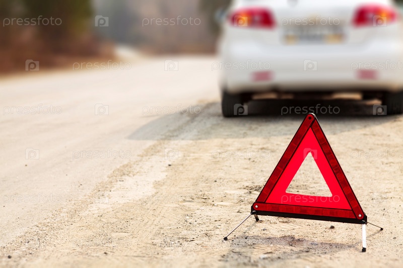Знак красного треугольника и автомобиль на дороге, малая глубина обзора