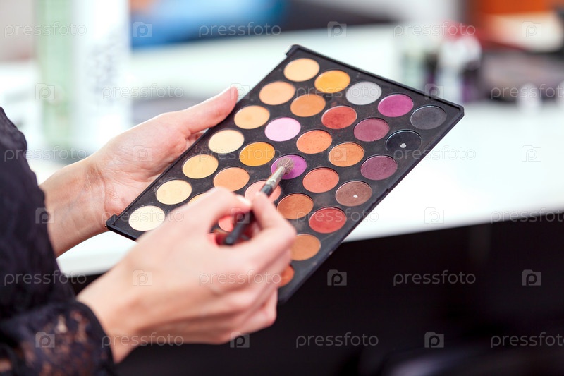 Крупным планом снимок палитры теней для век в руках специалиста по макияжу
