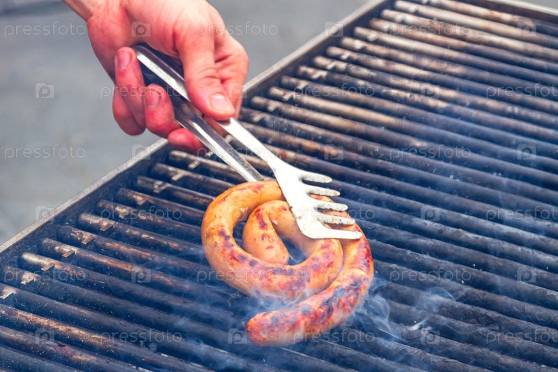 Мужская рука с вилкой трогает колбасу на гриле