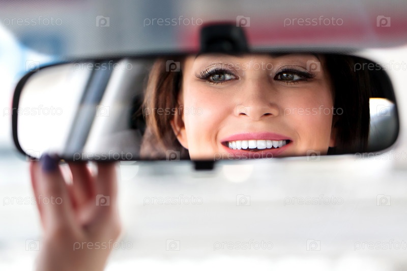Улыбающаяся счастливая женщина-водитель поправляет зеркало заднего вида рукой