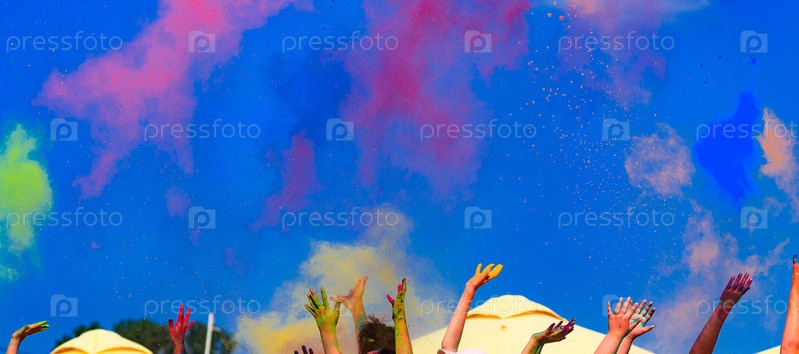 На цветном фестивале Холи, руки вверх, голубое небо позади