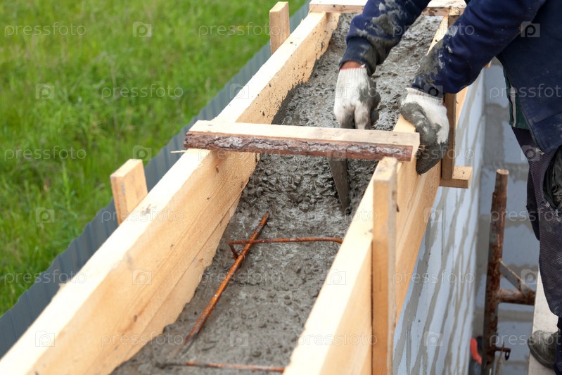 Рабочий выравнивает бетон в опалубке с помощью мастерка
