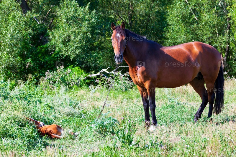 Взрослая лошадь-мать с жеребенком на пастбище