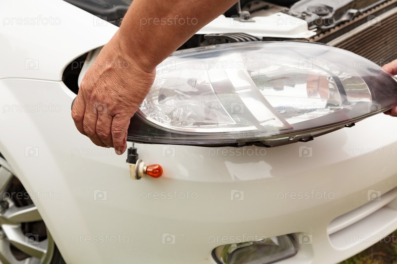 Ремонт фар. Механик держит новую запчасть