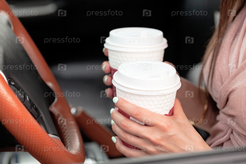 Снимок крупным планом рук женщины-водителя, которая держит два бумажных стаканчика с чаем или кофе