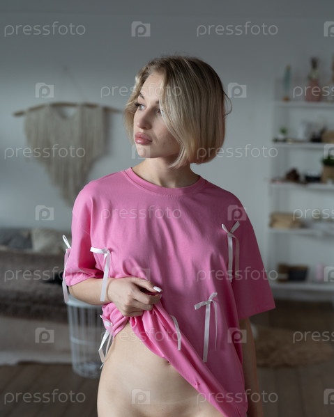 Молодая красивая женщина позирует в розовой футболке в студии
