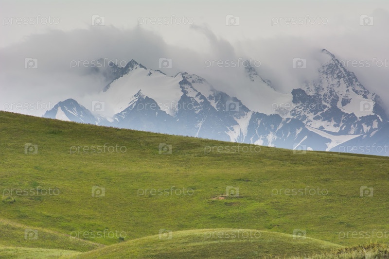 Снежные горные вершины среди облаков, Киргизский хребет, урочище Чонкурчак, страна Кыргызстан. Селективный фокус
