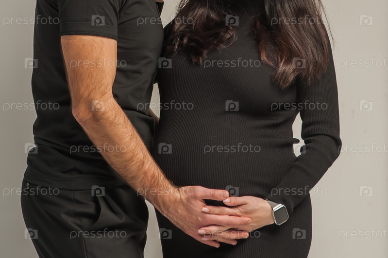 Мужчина и жена в позе 40 недель с большим животом, в черной одежде на белом, черном фоне, стоят