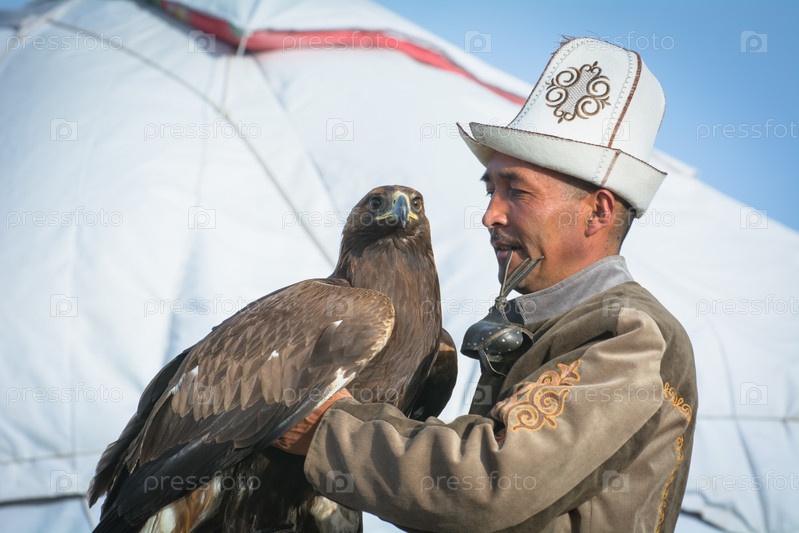 Молодой кыргызстанец держит на руке распростертые крылья орла