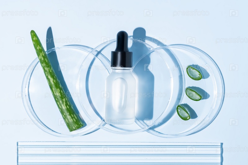 Свежие листья и ломтики алоэ вера, косметическая сыворотка с экстрактом алоэ вера в стеклянной бутылке с пипеткой в чашках Петри на белом фоне. Концепция натуральной косметики