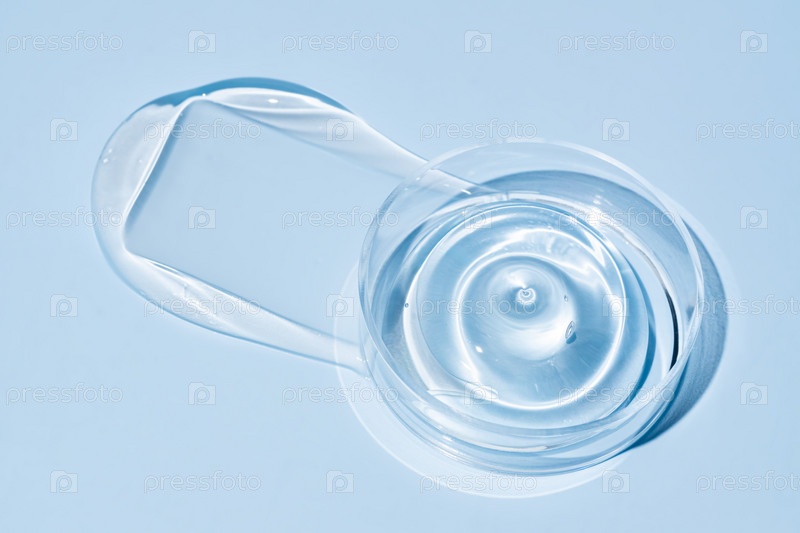 Плоская композиция с лабораторной посудой косметического геля и текстурой мазка геля на синем фоне. Косметические образцы экстракта алоэ в чашках Петри