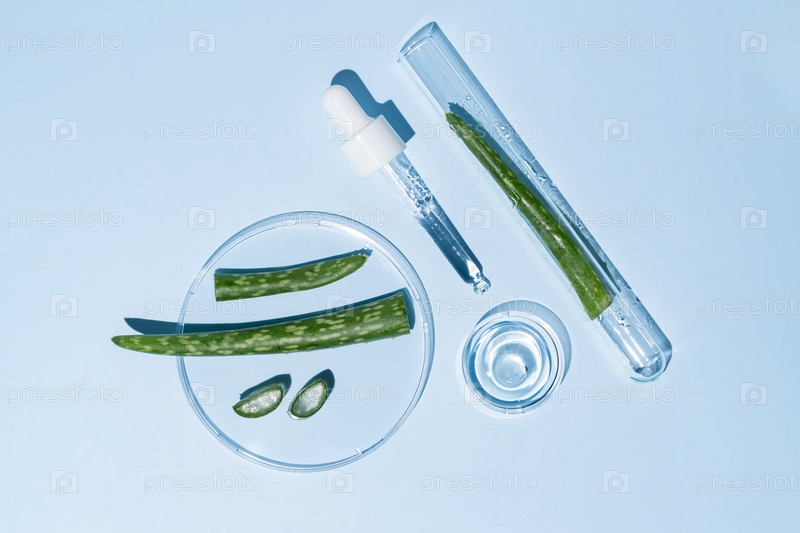 Гель или экстракт алоэ вера с помощью лабораторного оборудования, стеклянной посуды. Органическая зеленая косметика, уход за собой, концепция ухода за красотой на синем фоне с копировальным пространством