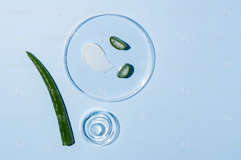 Плоская композиция с косметическим гелем, лабораторной посудой и алоэ на синем фоне. Косметические образцы экстракта алоэ в чашках Петри