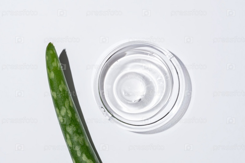 Фотография крупным планом чашки Петри, наполненной гелем алоэ вера и листом алоэ, на белом фоне