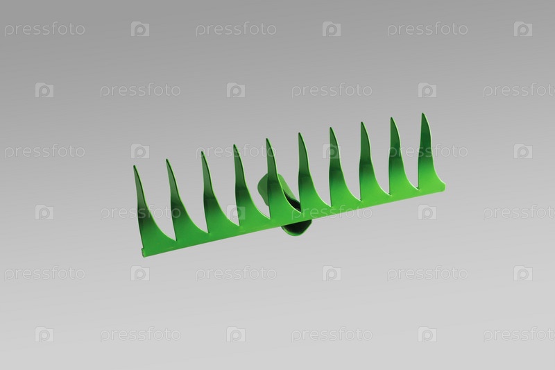 Зеленые садовые грабли. Крупный план. Изолированные на сером фоне
